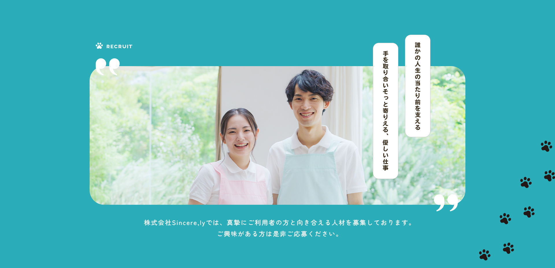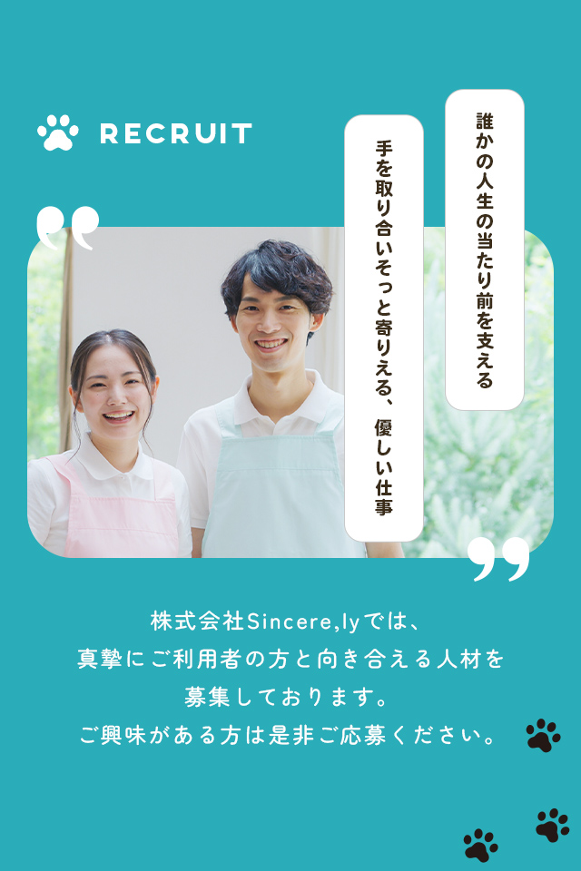犬や猫に優しく接するように、人の暮らしにも優しく寄り添える。それが訪問介護のお仕事です。動物好きな方は、きっと人にも自然とやさしいまなざしを向けられるはず。特別な経験がなくても大丈夫。あなたの「やさしさ」が、誰かの大きな安心につながります。人の「日常」や「笑顔」を大切にあなたのやさしさを活かし、一緒に温かな介護を届けませんか。