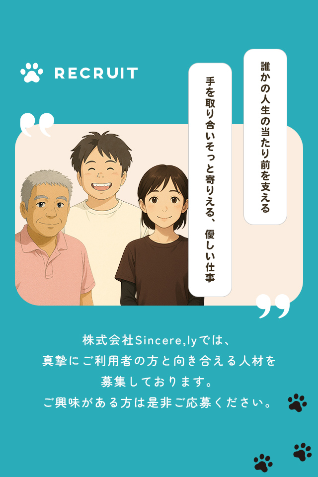 犬や猫に優しく接するように、人の暮らしにも優しく寄り添える。それが訪問介護のお仕事です。動物好きな方は、きっと人にも自然とやさしいまなざしを向けられるはず。特別な経験がなくても大丈夫。あなたの「やさしさ」が、誰かの大きな安心につながります。人の「日常」や「笑顔」を大切にあなたのやさしさを活かし、一緒に温かな介護を届けませんか。